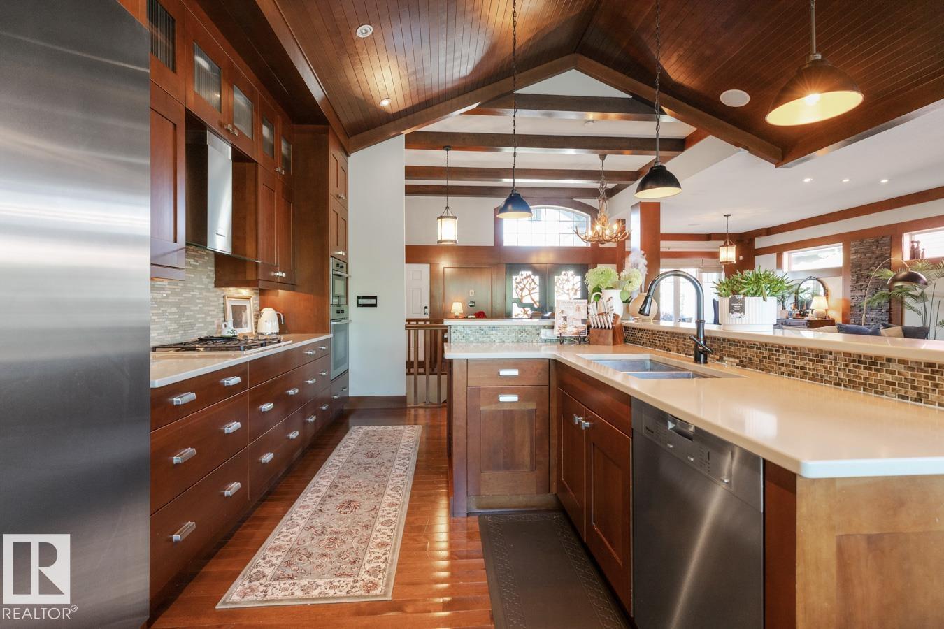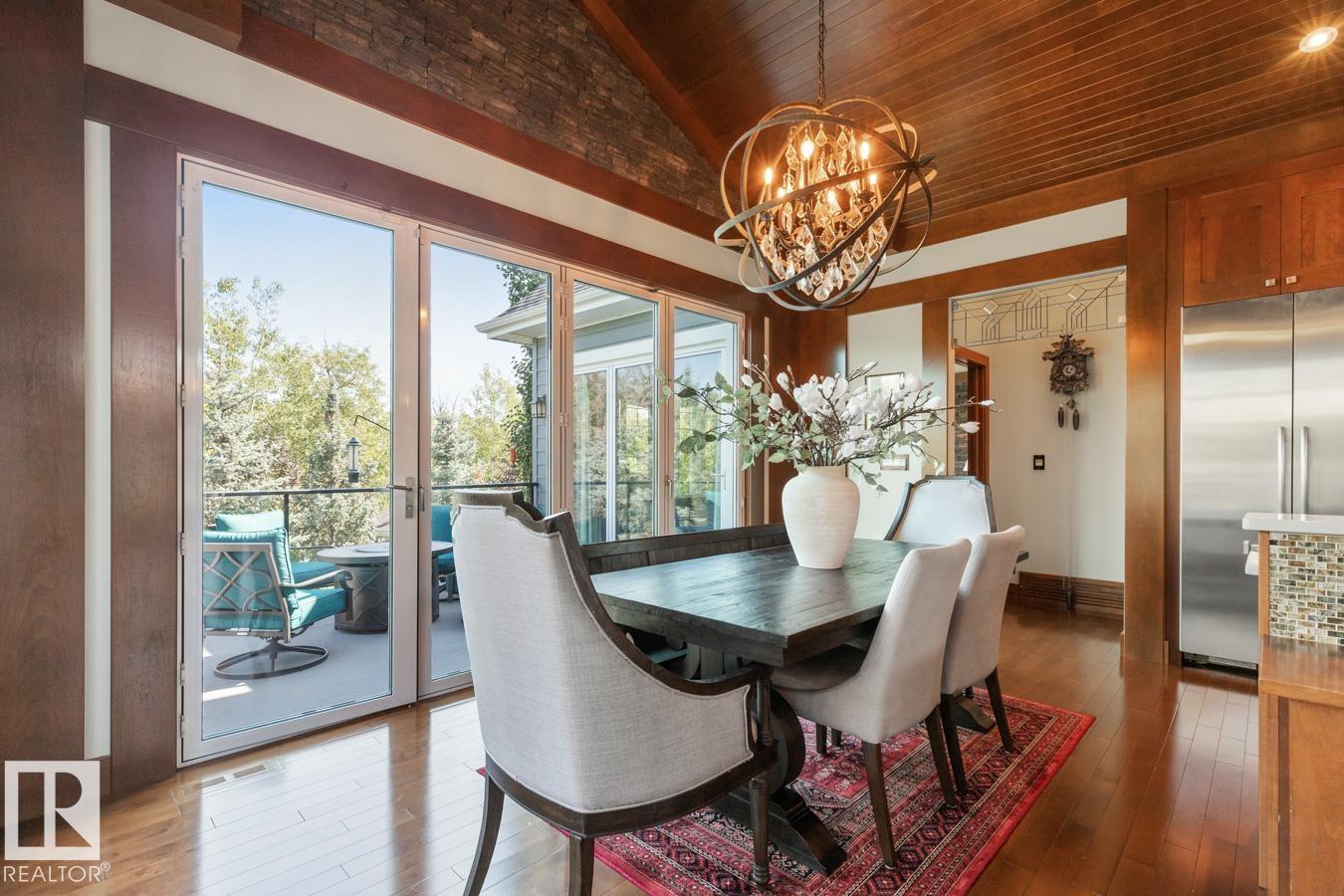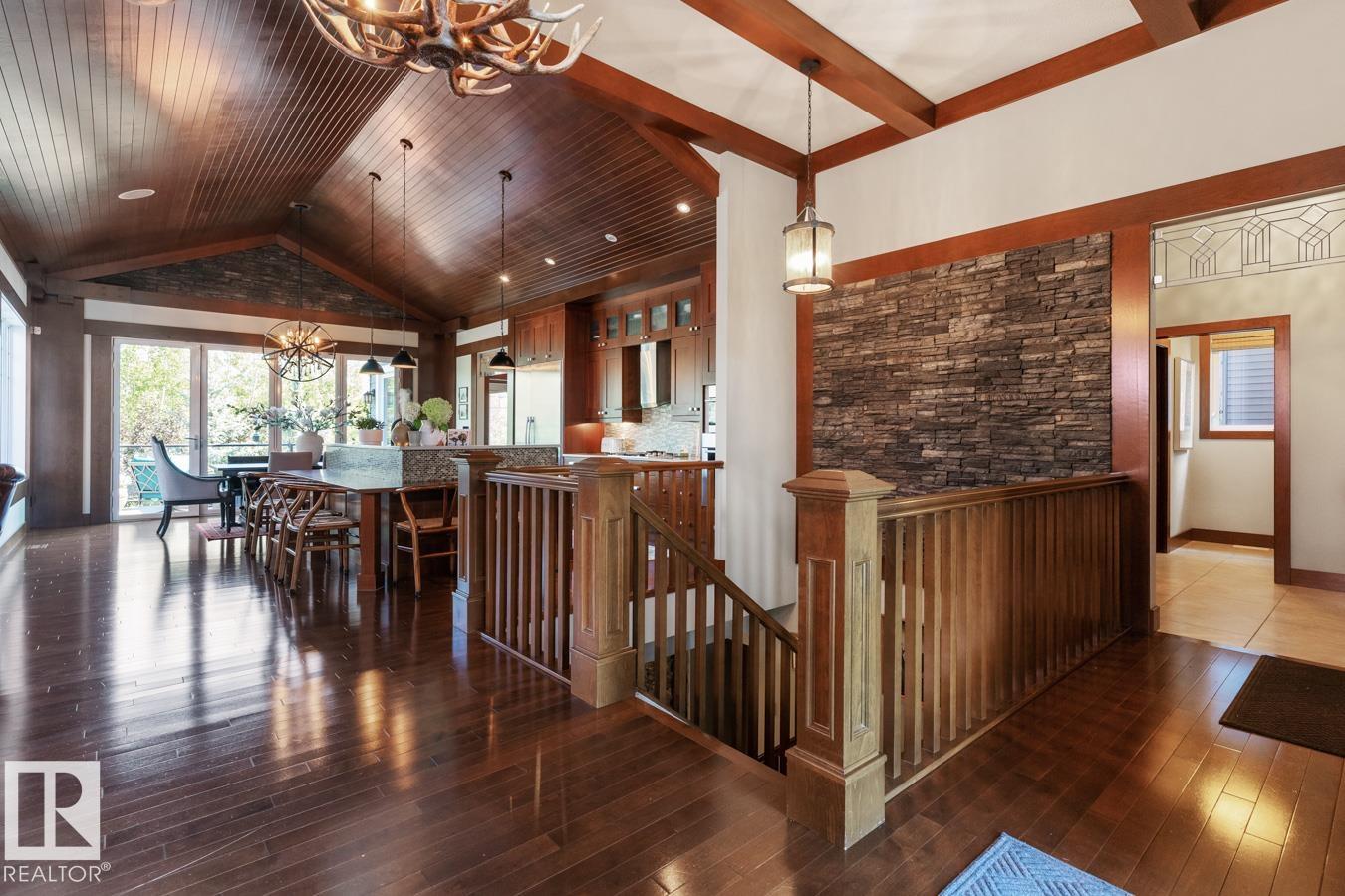 This stunning former Full House Lottery Dream Home offers luxury living in the exclusive Westpointe of Windermere, BACKING ONTO A TRANQUIL RAVINE. Built by Perry Built Homes, this WALKOUT BUNGALOW combines rustic elegance with high-end finishes?featuring soaring vaulted ceilings, rich wood and stone accents, and over 3,500 sqft of finished space. Inside you'll find Miele appliances, Control4 system, heated floors (basement + ensuite), a soundproofed theatre room, and a beautifully designed wine cellar. Expansive custom bifold sliding doors on both levels create seamless indoor-outdoor living. The double-sided fireplace anchors the open-concept main floor, while breathtaking landscaping enhances the front and back yards. Every detail of this home has been thoughtfully crafted for refined living and lasting enjoyment. With HardiePlank® siding, oversized garage, and ravine views, this home is a rare find that must be seen in person.