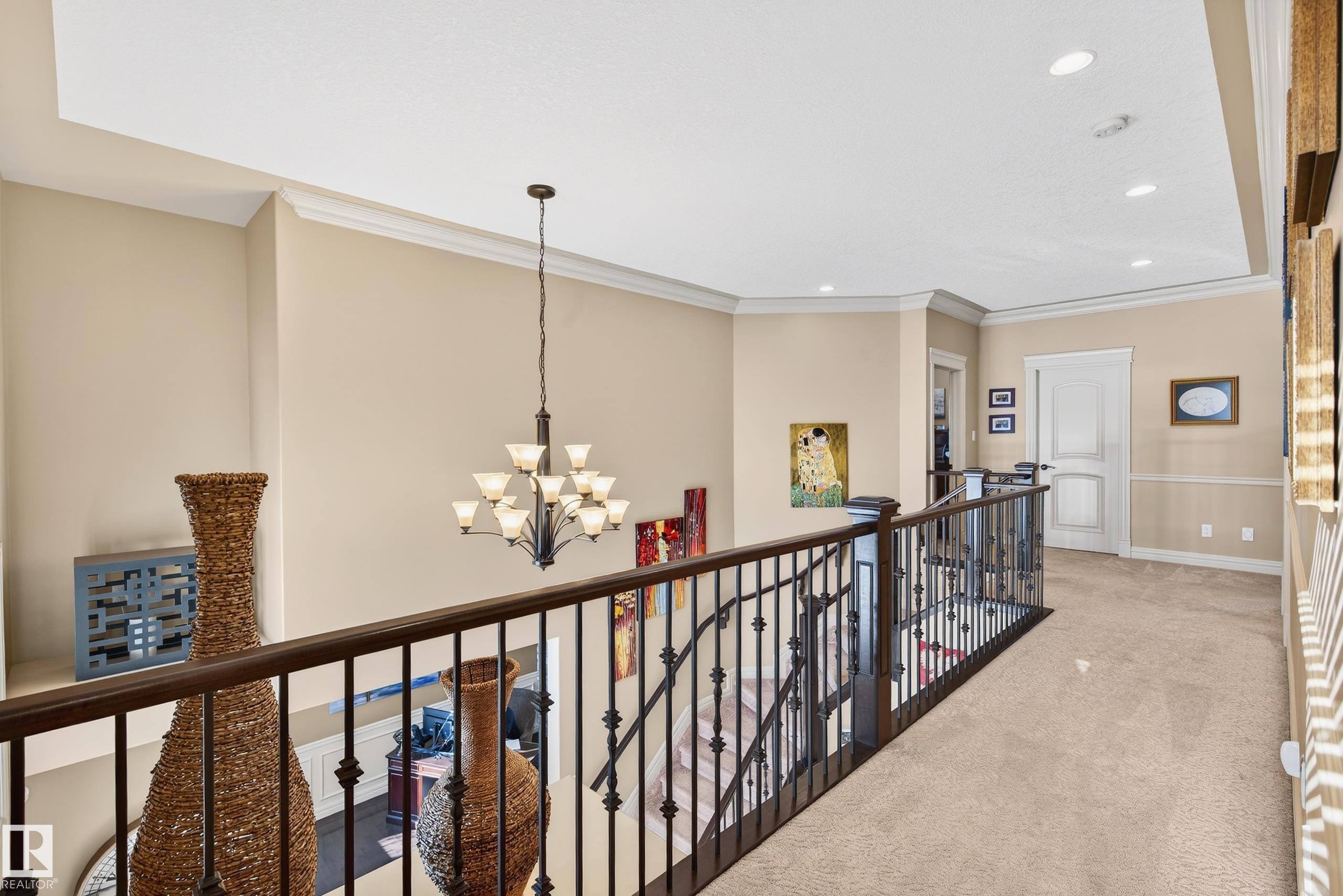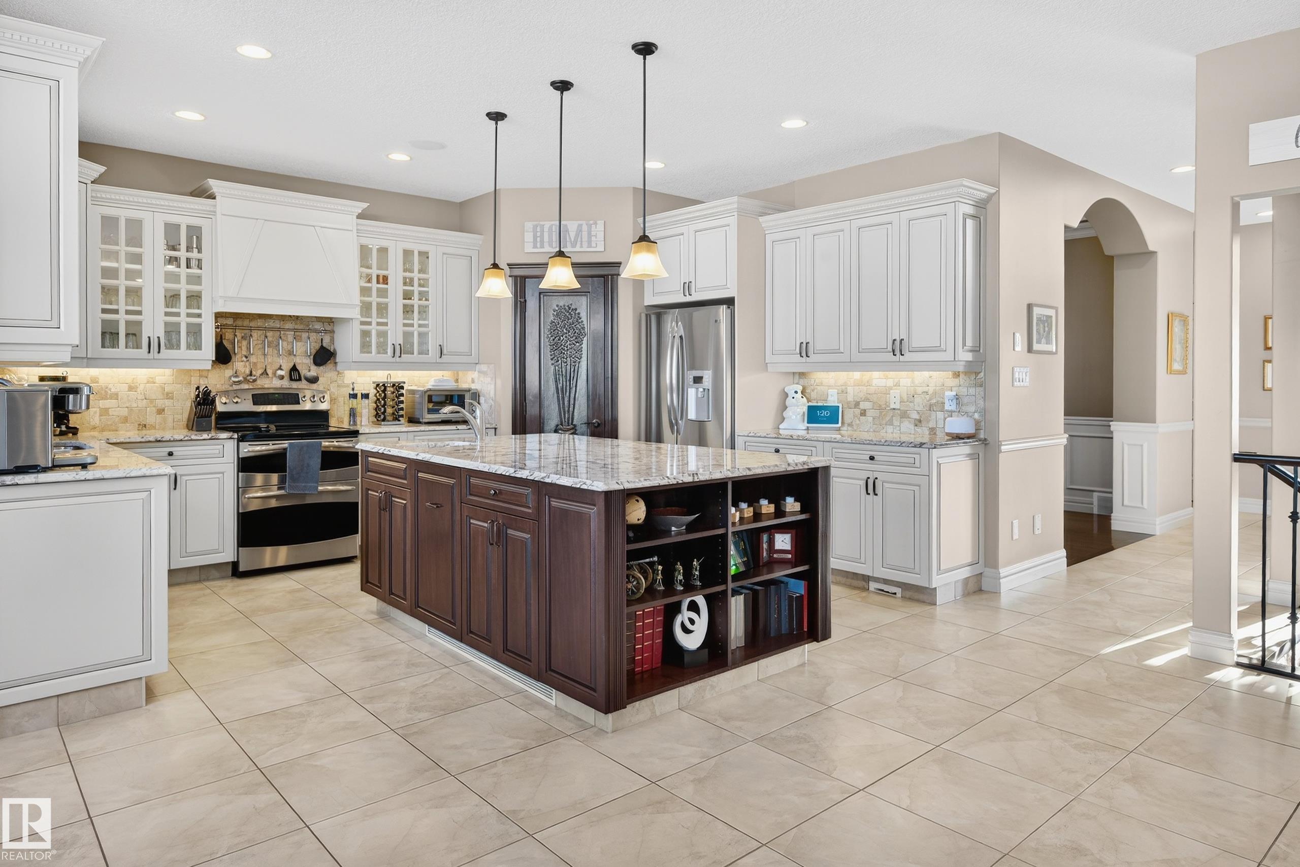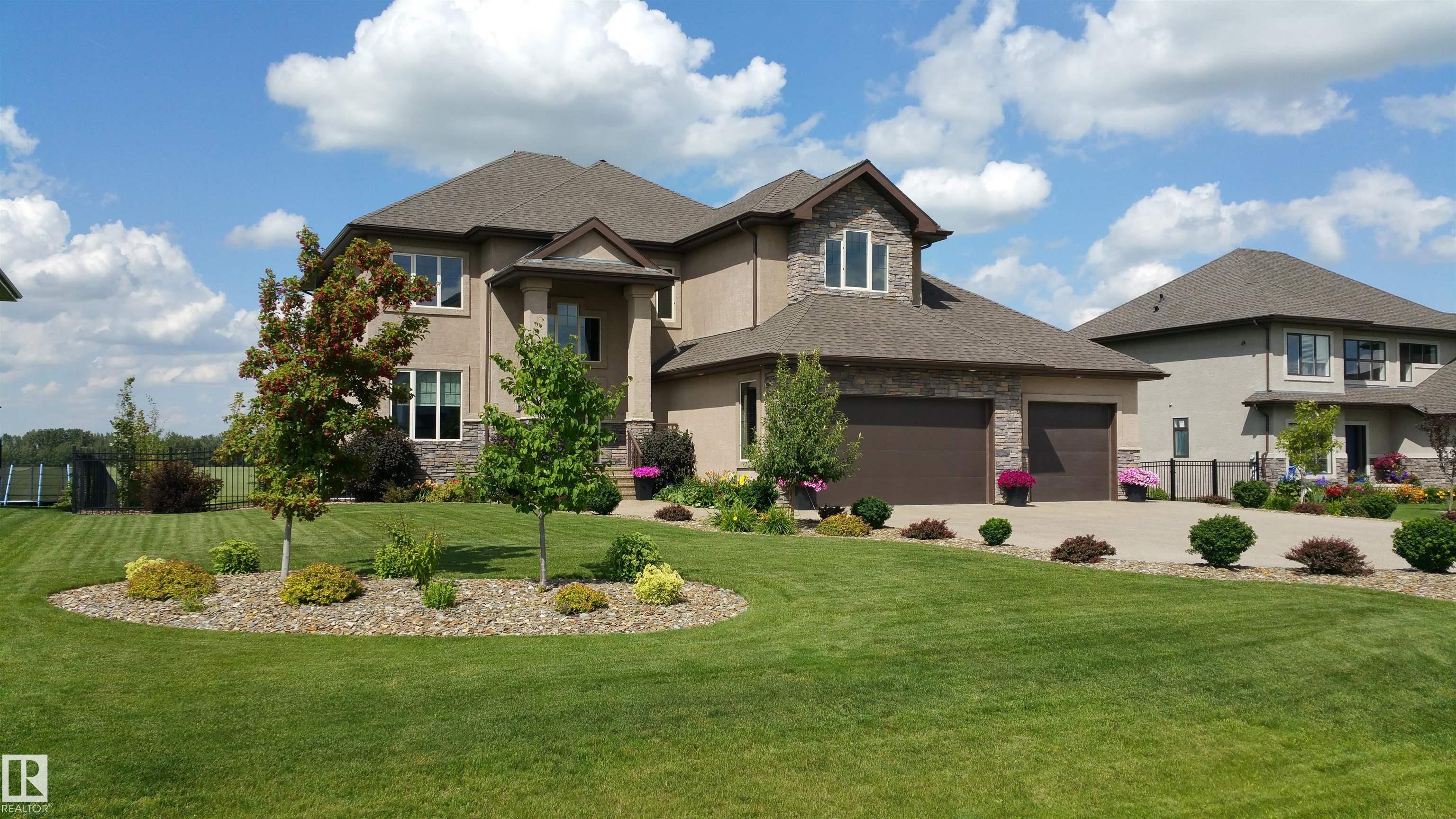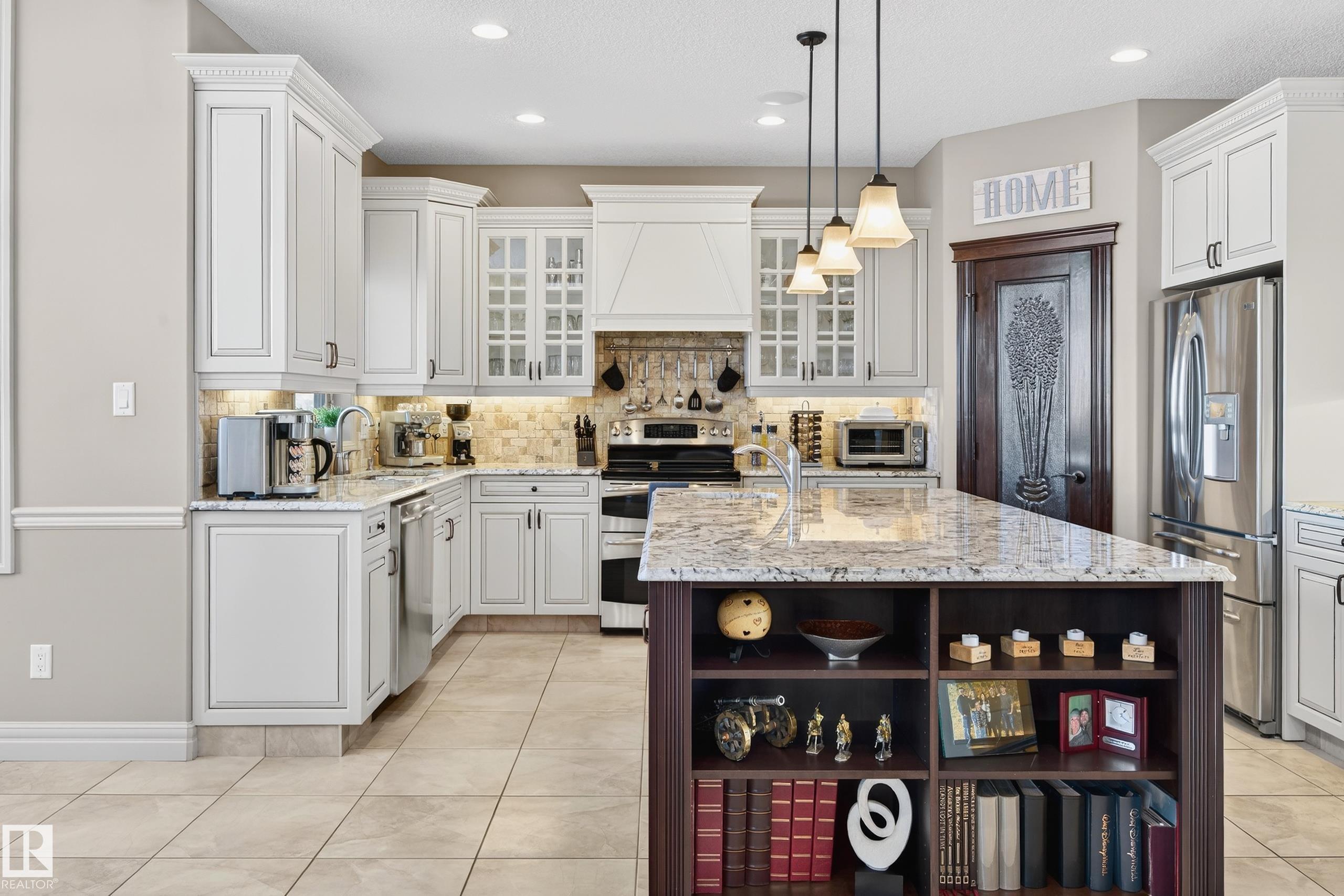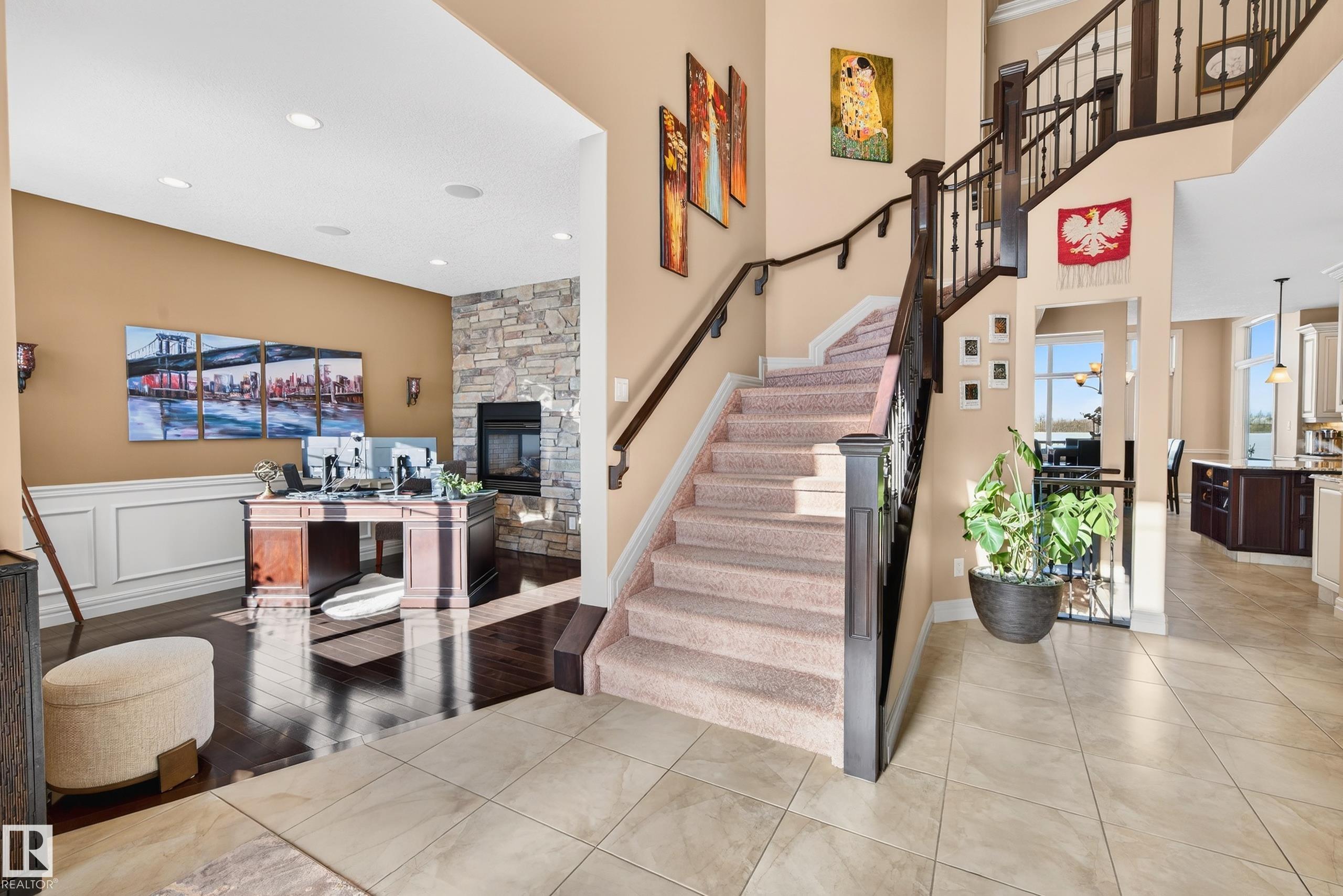 Situated on a half-acre lot in prestigious Upper Manor Estates, this exceptional custom built 2-storey offers over 4500 sq ft of refined, fully finished living space where every detail has been thoughtfully considered. The bright entry opens to an open office and a stunning kitchen with premium appliances, a large island, ample cabinetry, and an inviting sunlit nook. The living room impresses with a dramatic stone arch wall and a dual-sided fireplace creating warmth throughout the main living space, while the main floor laundry adds everyday functionality. Upstairs, the four generous bedrooms include an expansive primary suite with a sitting room, luxurious ensuite and its own private deck with a room for a hot tub, creating a true oasis. The finished basement adds a massive rec room, wet bar, fifth flex/bedroom, and full bath. Outside, enjoy a professionally finished yard an irrigation system and an oversized triple garage with h/c water, drain, tall ceilings and a drive-through bay for additional space.