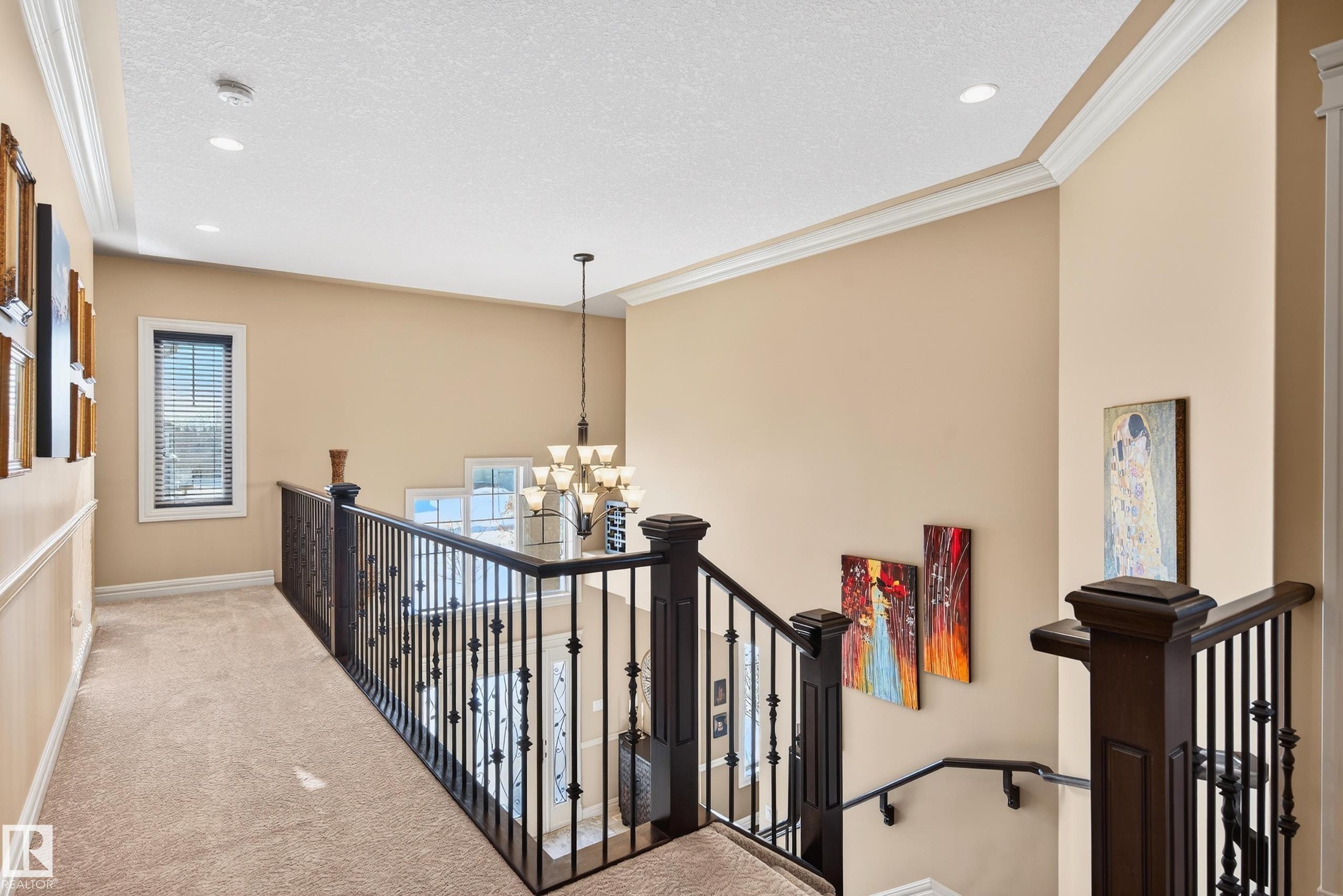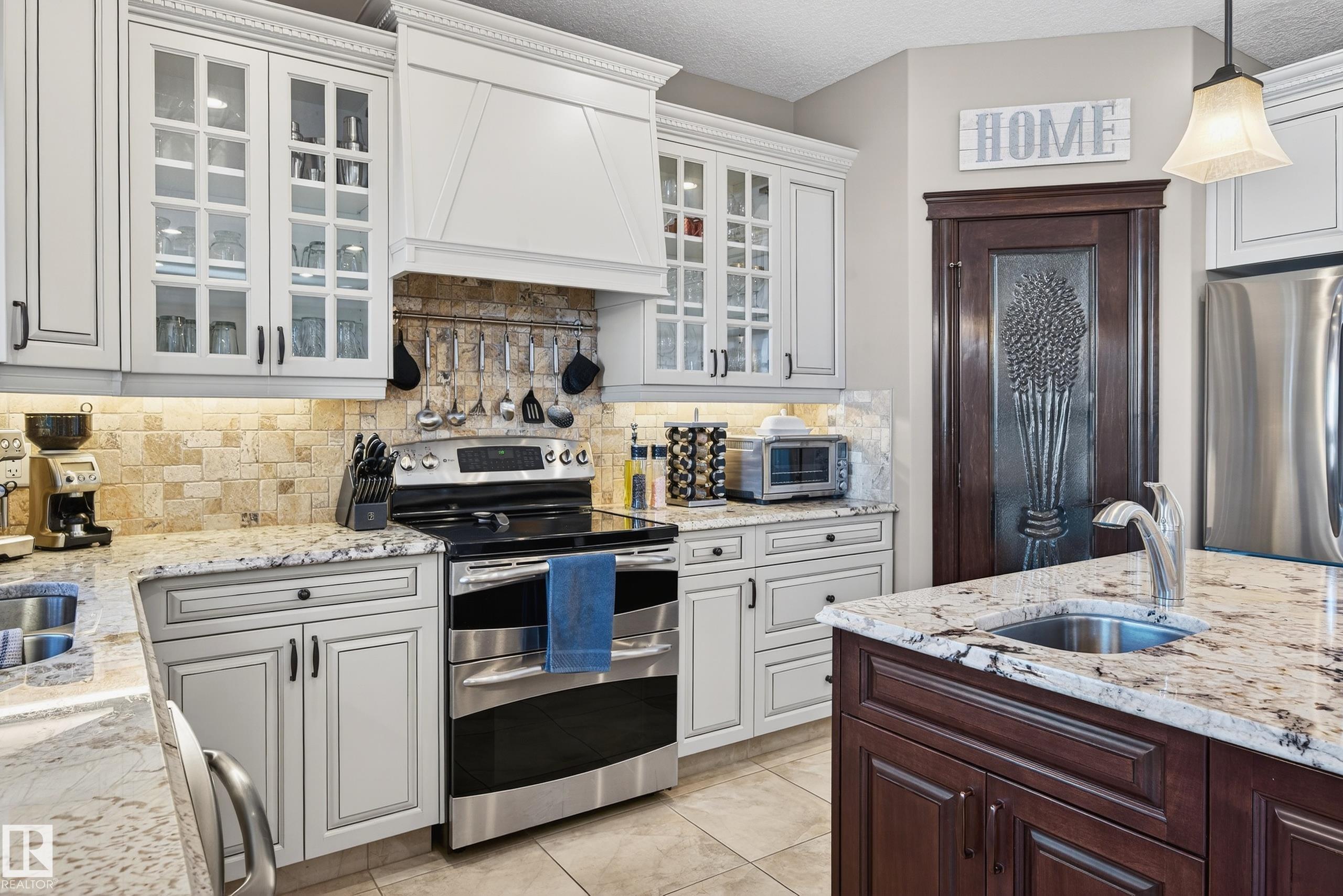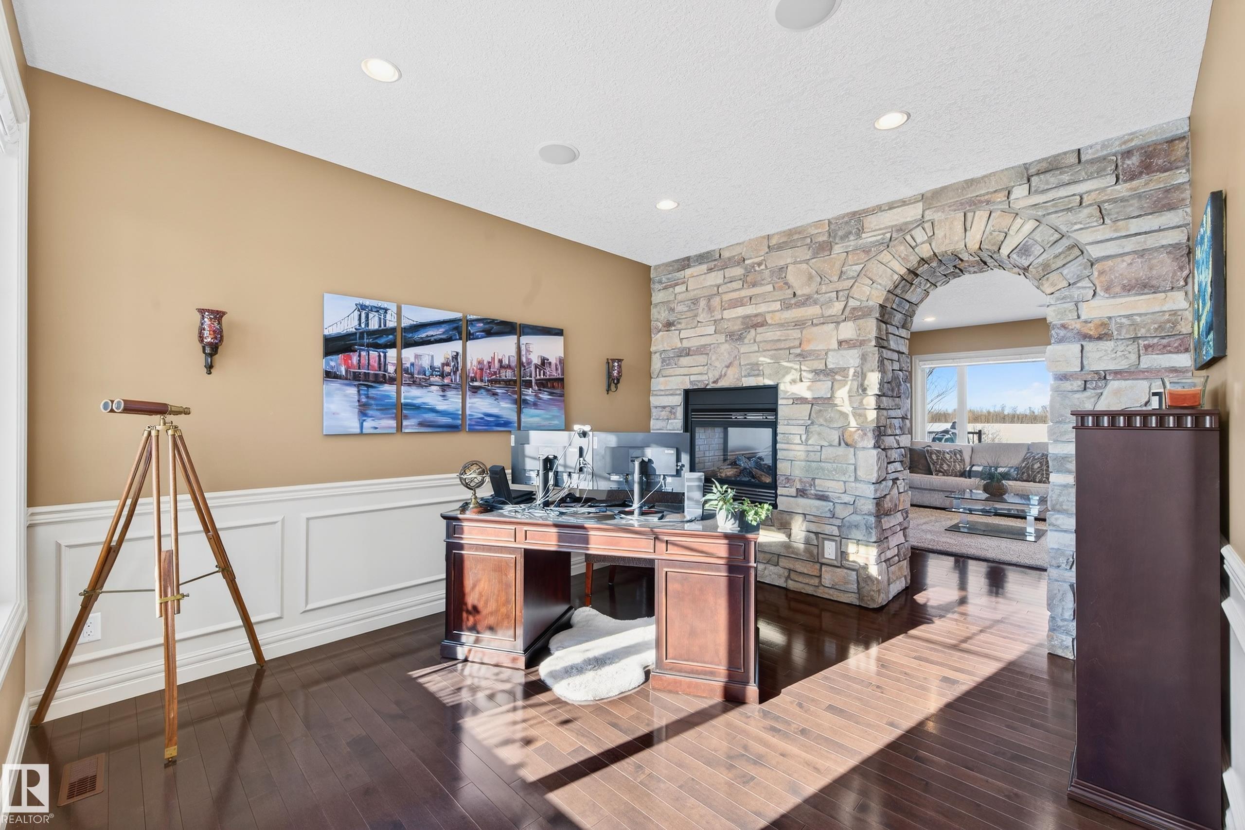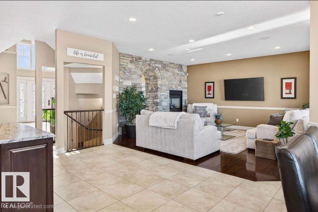 Situated on a half-acre lot in prestigious Upper Manor Estates, this exceptional custom built 2-storey offers over 4500 sq ft of refined, fully finished living space where every detail has been thoughtfully considered. The bright entry opens to an open office and a stunning kitchen with premium appliances, a large island, ample cabinetry, and an inviting sunlit nook. The living room impresses with a dramatic stone arch wall and a dual-sided fireplace creating warmth throughout the main living space, while the main floor laundry adds everyday functionality. Upstairs, the four generous bedrooms include an expansive primary suite with a sitting room, luxurious ensuite and its own private deck with a room for a hot tub, creating a true oasis. The finished basement adds a massive rec room, wet bar, fifth flex/bedroom, and full bath. Outside, enjoy a professionally finished yard an irrigation system and an oversized triple garage with h/c water, drain, tall ceilings and a drive-through bay for additional space.