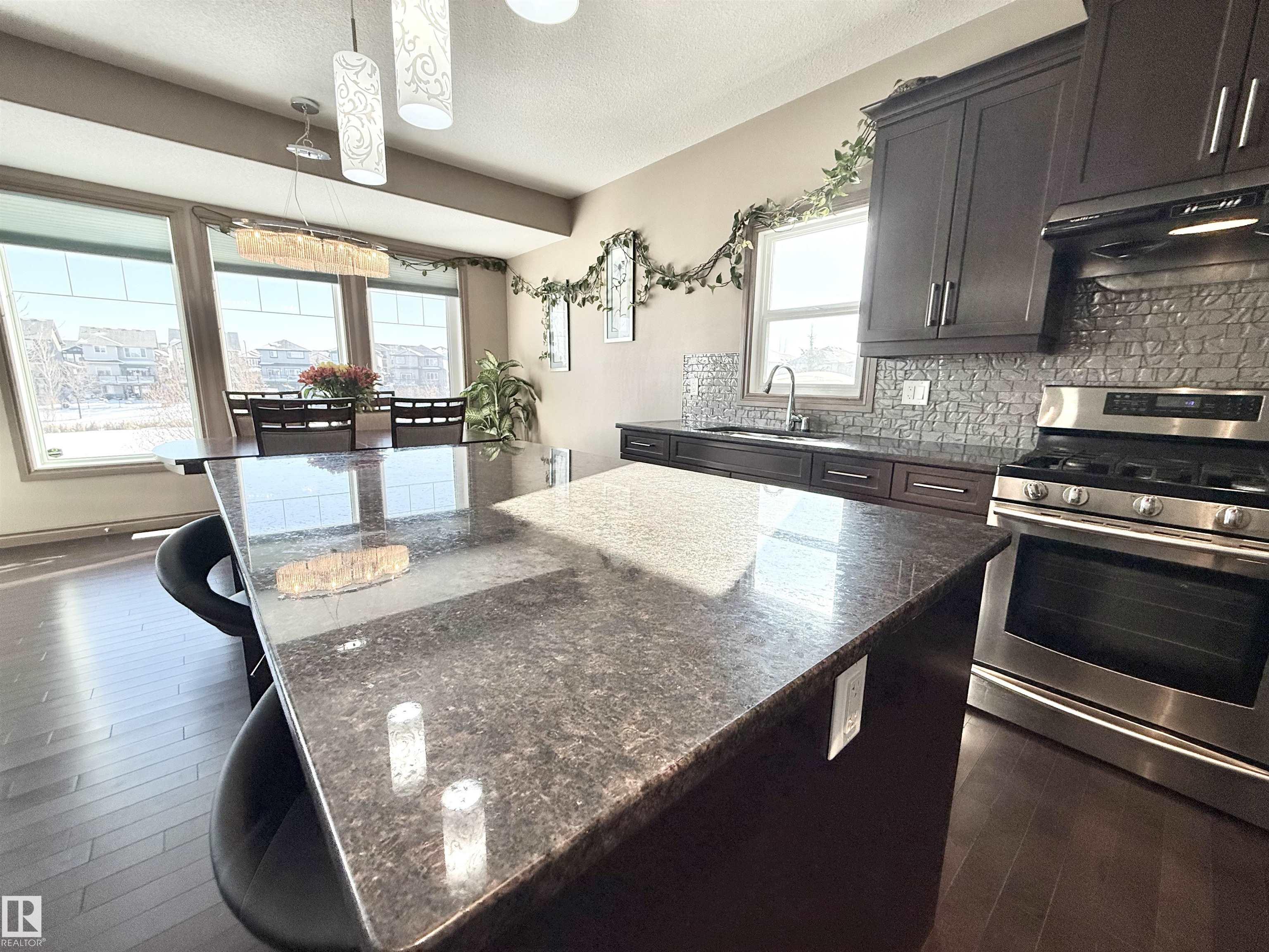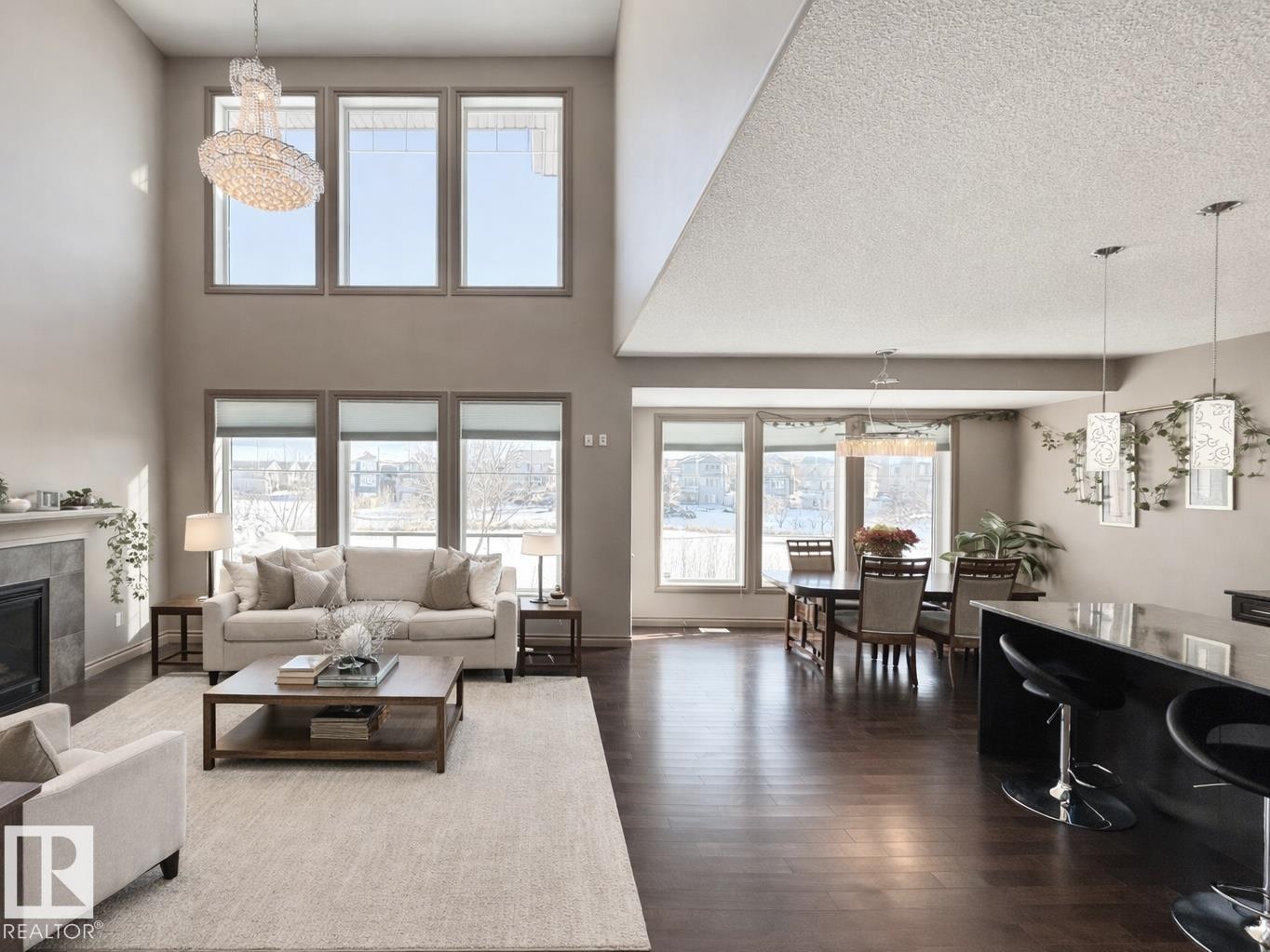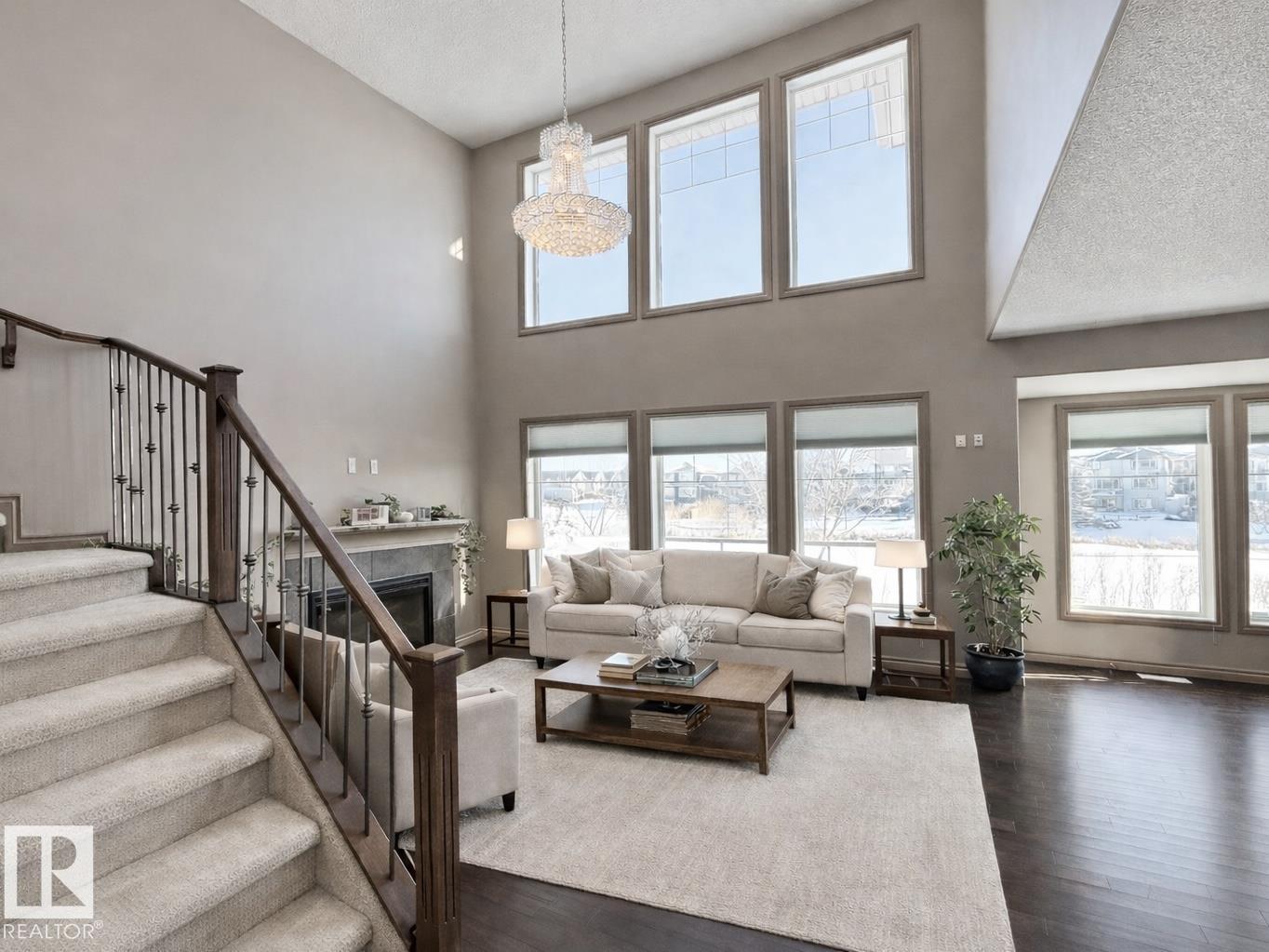 Welcome to this stunning lake-view, walkout basement two-storey home in prestigious Windermere. Built in 2013, this home offers over 3,300 sq.ft. of total living space, including 2,330 sq.ft. above grade plus a fully finished basement. The main floor features 9-ft ceilings and a dramatic 19-ft open-to-above living room with a full wall of windows, filling the space with natural light. Hardwood flooring complements the open-concept kitchen with stainless steel appliances, granite countertops, ample cabinetry, and a walkthrough pantry. A functional mudroom with laundry and sink connects to an oversized attached double garage. This level also includes a bedroom/office and a 2-piece bath. Upstairs offers a bonus room, a spacious primary suite with lake views, a 5-piece ensuite and walk-in closet, plus two additional bedrooms and a full bath. The bright walkout basement features a large family room, two bedrooms, and a full bath. Close to schools, shopping, and Henday. Rare opportunity!