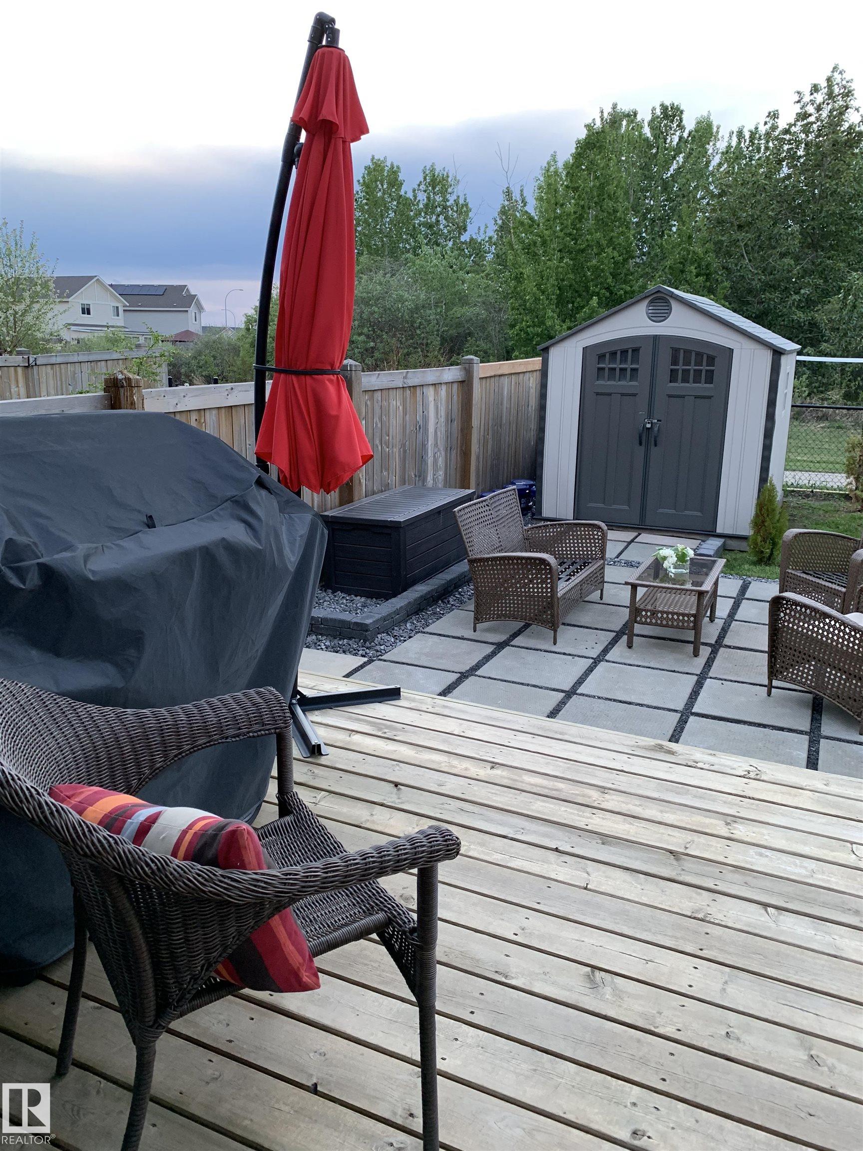 Gorgeous and very well maintained half duplex backing treed walking path. Step inside this pride of ownership home featuring freshly painted (2023) upgraded laminate flooring, large peninsula style kitchen with loads of cabinets, 4 appliances, breakfast bar, custom built corner pantry (Feb '25) with 2 lazy Susan's, organizer shelves & plenty of storage. Sunny & bright dining/living areas with access to private fenced yard, large newer deck/patio (2019), landscaping redone with new gate (2020) and storage shed. Mainfloor laundry/mud area with countertop, shelving, bench and shiplap feature wall. Upstairs you'll be greeted with a new carpet (Dec '24) on the stairs and in the cozy bonus room, 2 huge primary bedrooms with new flooring (2023) full ensuites, large walk-in closets with additional built-in shelving and pull-out drawers. New Zebra blinds on mainfloor and upstairs. Garage is very tidy with epoxy flooring, new landing and heavy duty wall organizer. No condo fee's & move-in ready.