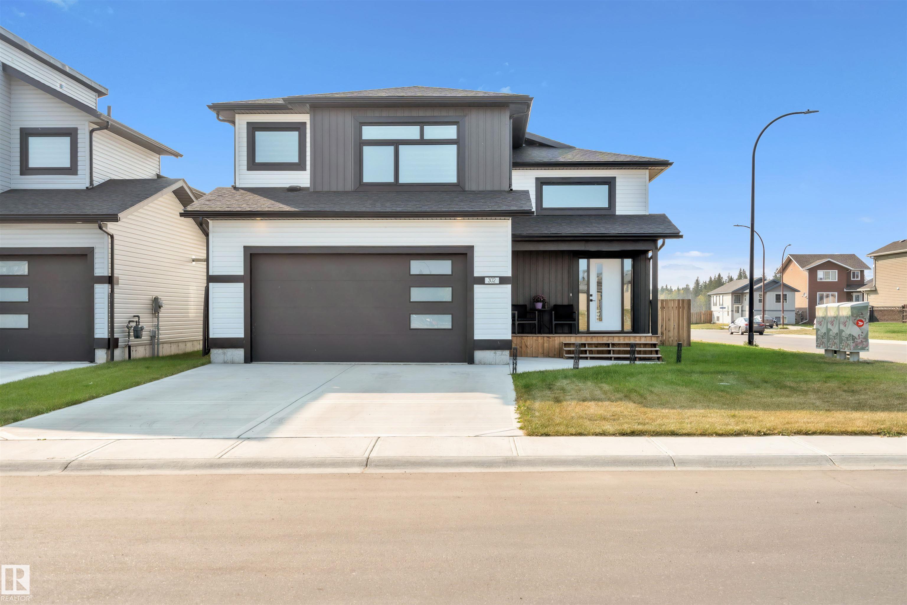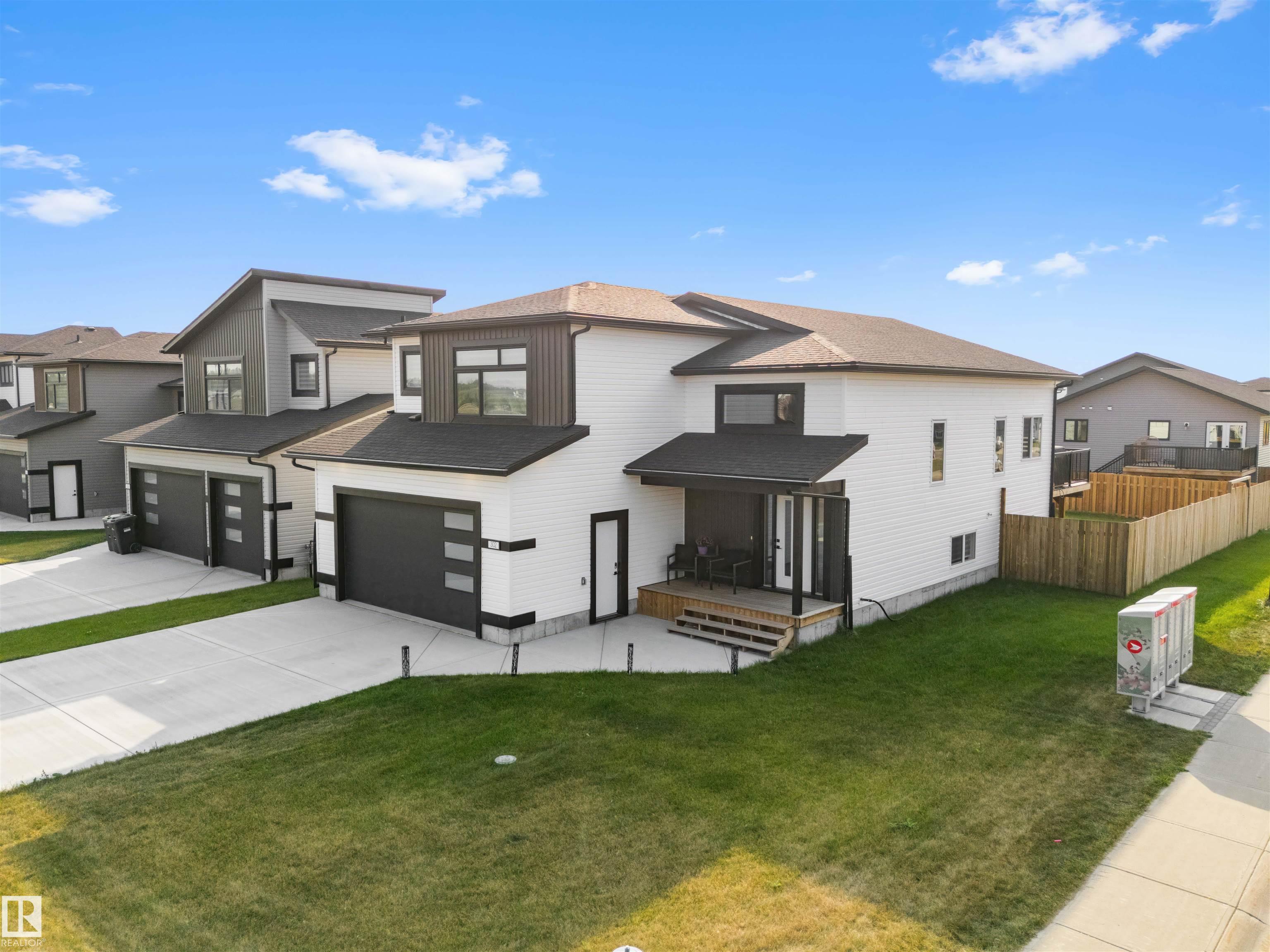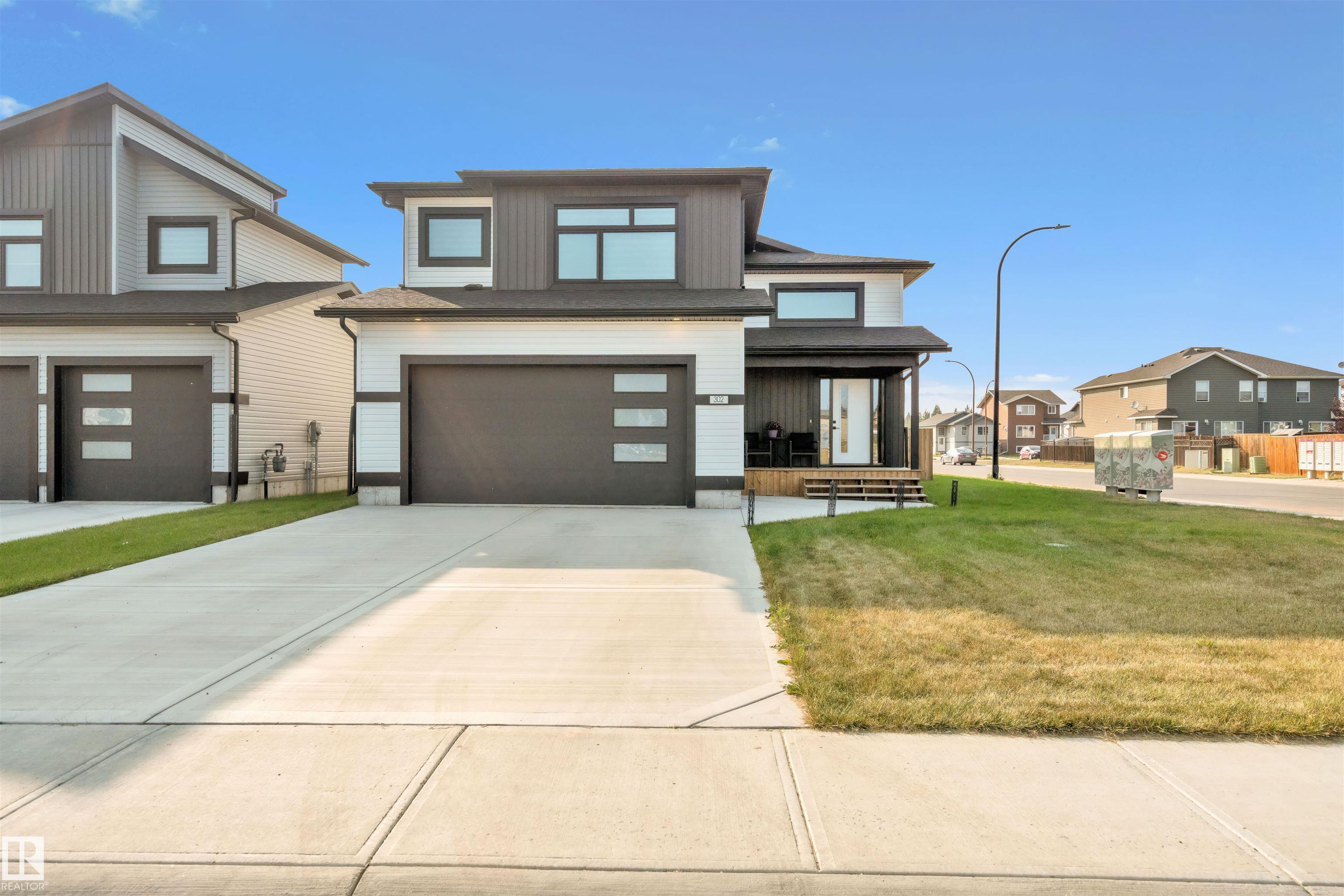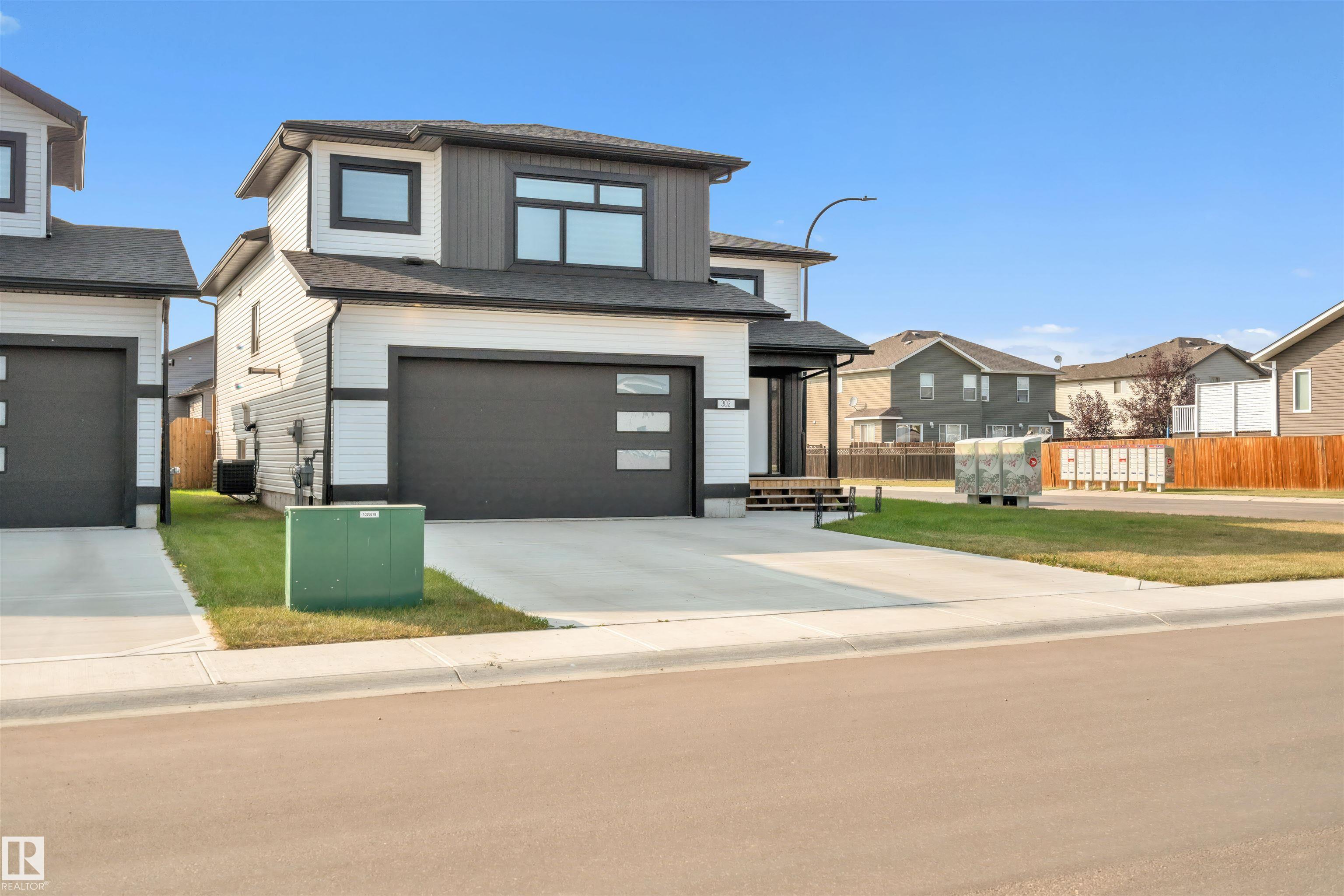 Modern Hailey style bi-level, featuring a double heated garage, perfectly located in Cold Lake North close to Kinosoo Beach, the hospital, and walking trails! As you enter the front door you are welcomed by a generous entry with access to the garage. Spacious living room with 10ft ceilings includes black shiplap feature fireplace. The kitchen showcases modern white cabinetry with quartz countertops, a large island, and stainless steel appliances including gas range. To complete this floor are two bedrooms and main bathroom along with dedicated laundry room. Up a few steps you enter the spacious primary bedroom with 2 walk in closets, and FULL ensuite with dual sinks, tiled glass shower & separate tub. The fully finished basement features in-slab heat and consists of a family room, 2 more bedrooms and full bathroom. The home has Central AC and custom window coverings for everyday living and optimal comfort. The yard is fully landscaped and fenced and includes a concrete driveway and sidewalk & large gate.