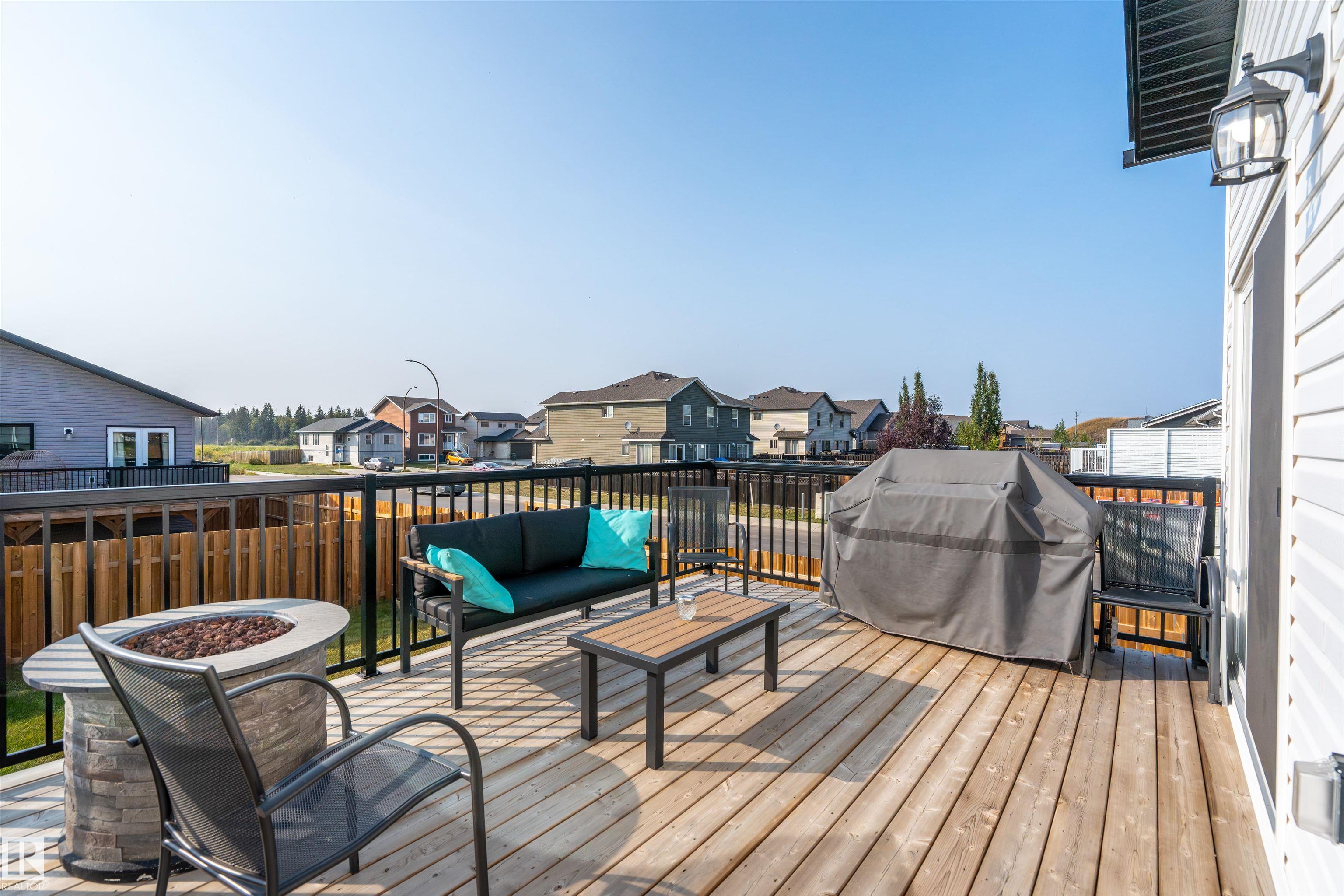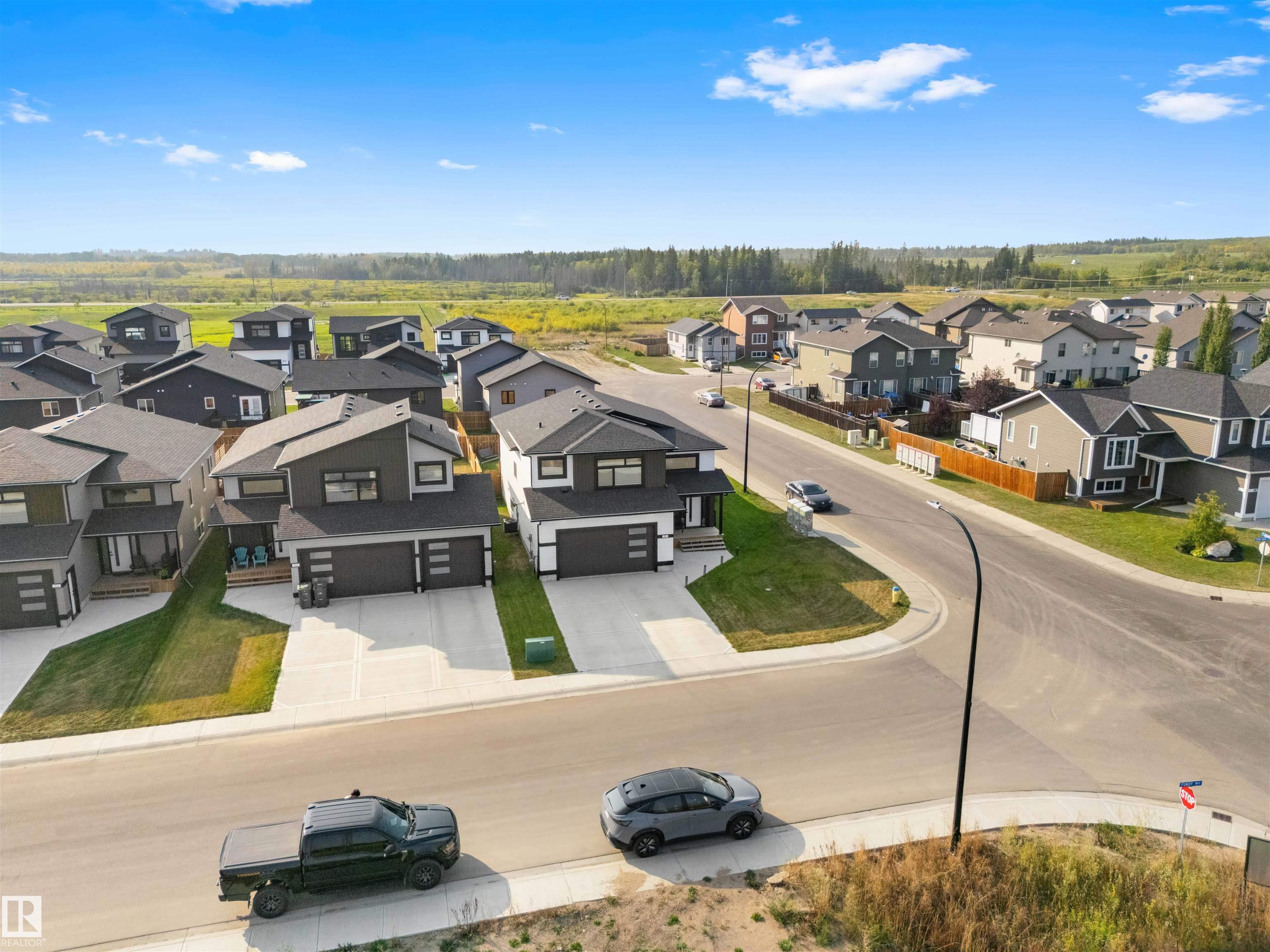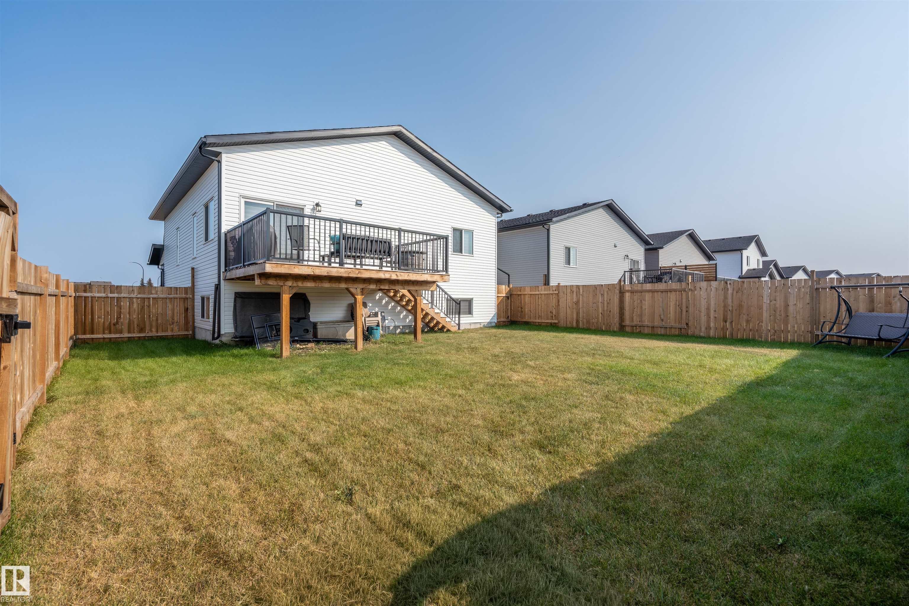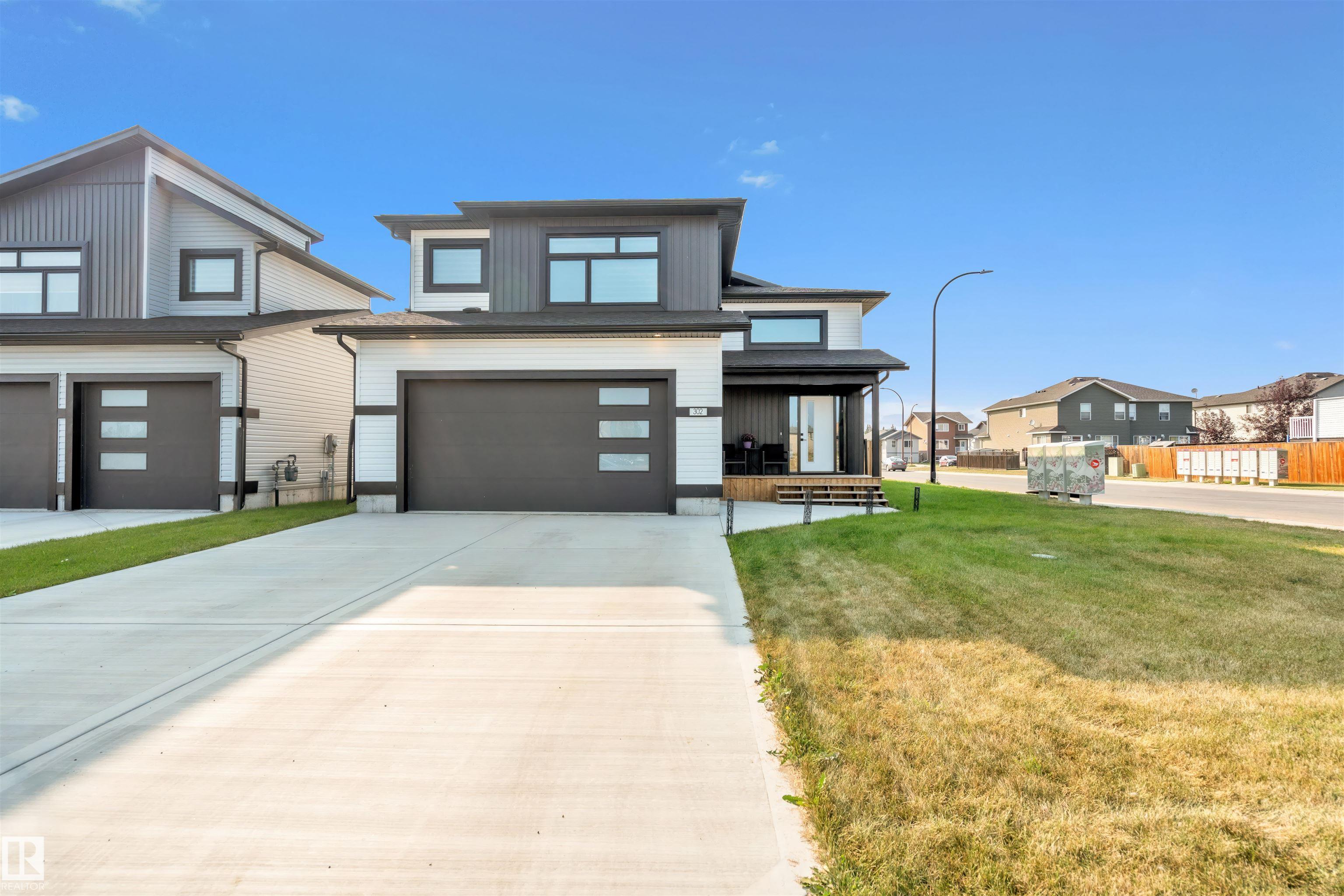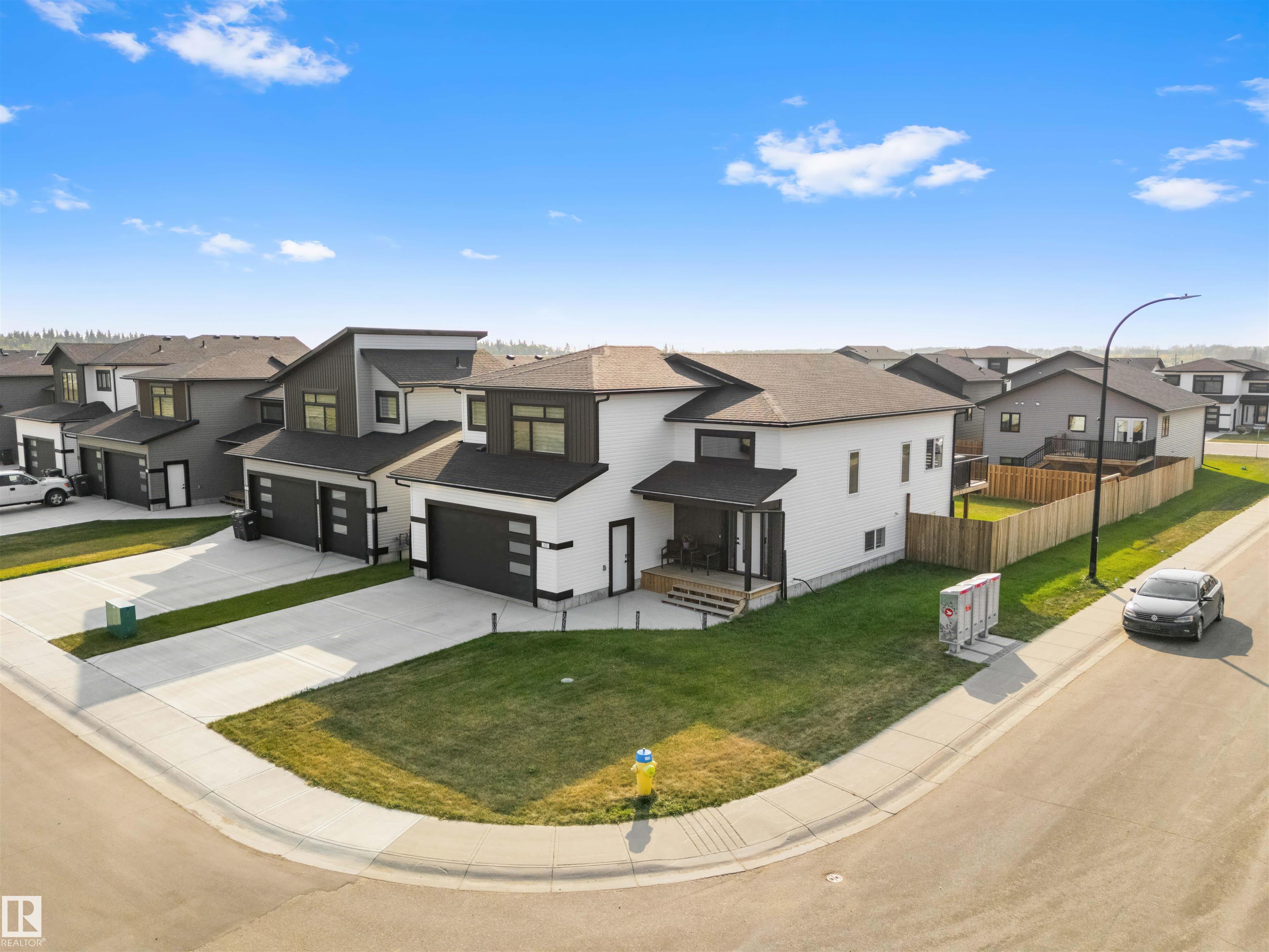 Modern Hailey style bi-level, featuring a double heated garage, perfectly located in Cold Lake North close to Kinosoo Beach, the hospital, and walking trails! As you enter the front door you are welcomed by a generous entry with access to the garage. Spacious living room with 10ft ceilings includes black shiplap feature fireplace. The kitchen showcases modern white cabinetry with quartz countertops, a large island, and stainless steel appliances including gas range. To complete this floor are two bedrooms and main bathroom along with dedicated laundry room. Up a few steps you enter the spacious primary bedroom with 2 walk in closets, and FULL ensuite with dual sinks, tiled glass shower & separate tub. The fully finished basement features in-slab heat and consists of a family room, 2 more bedrooms and full bathroom. The home has Central AC and custom window coverings for everyday living and optimal comfort. The yard is fully landscaped and fenced and includes a concrete driveway and sidewalk & large gate.