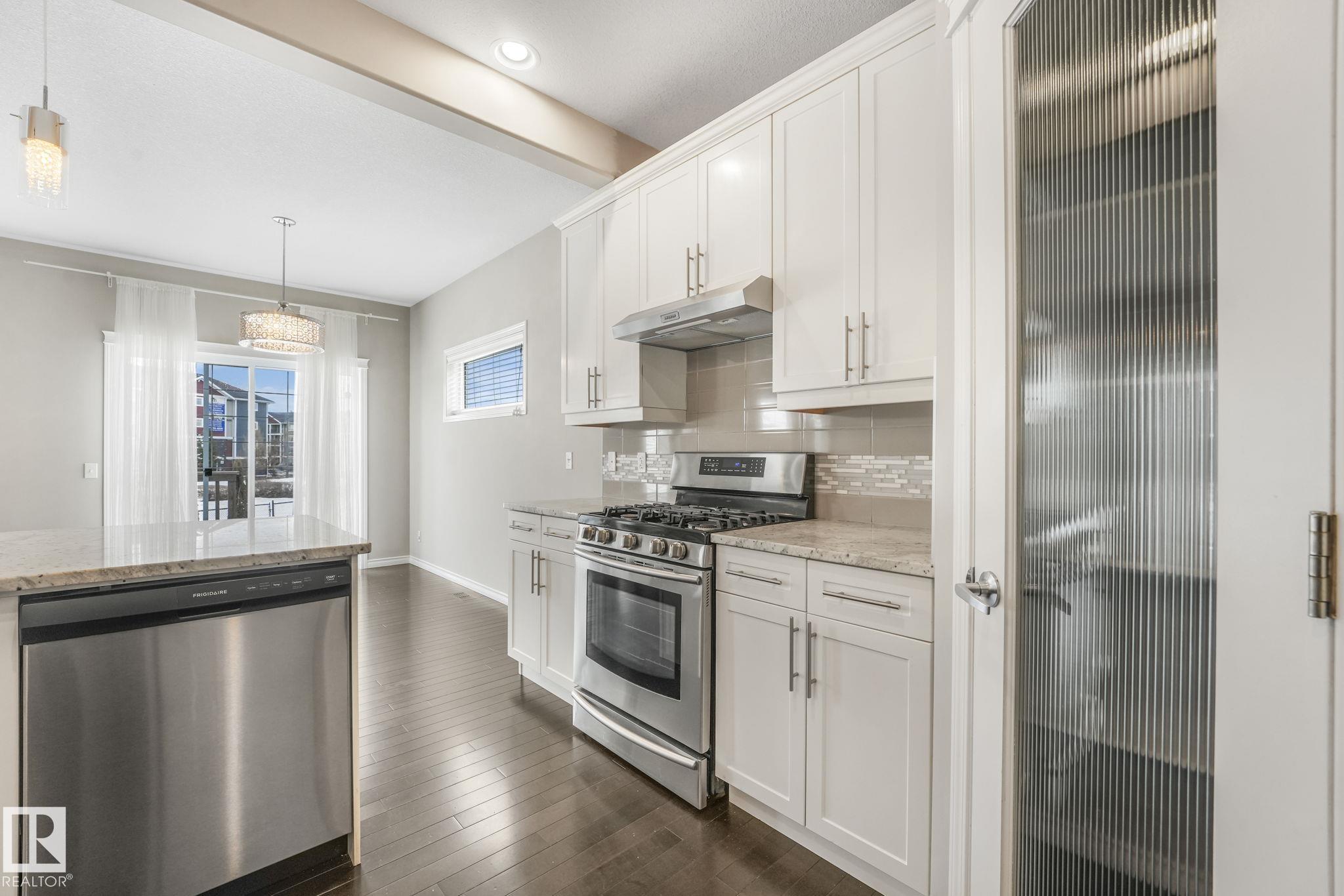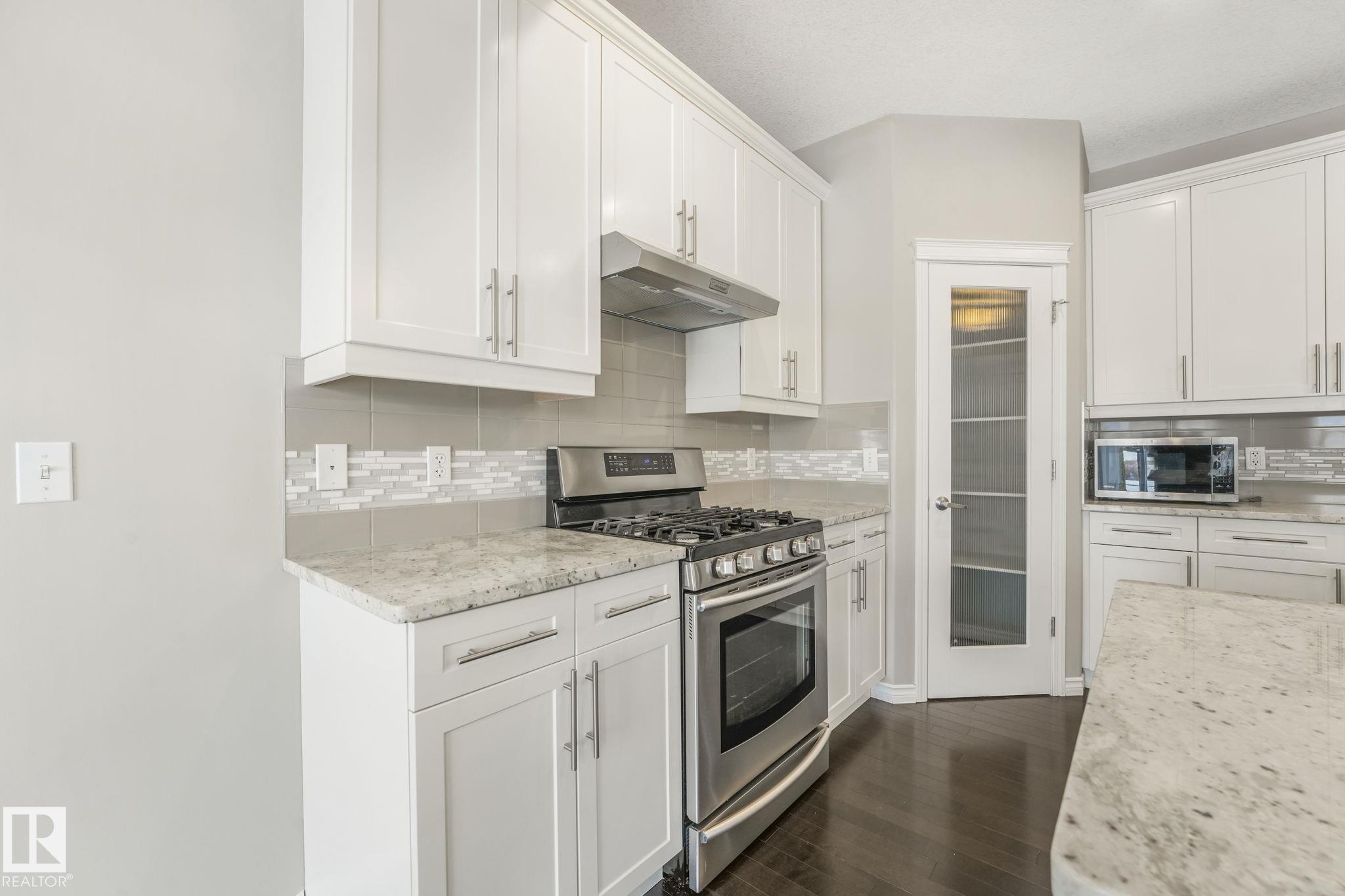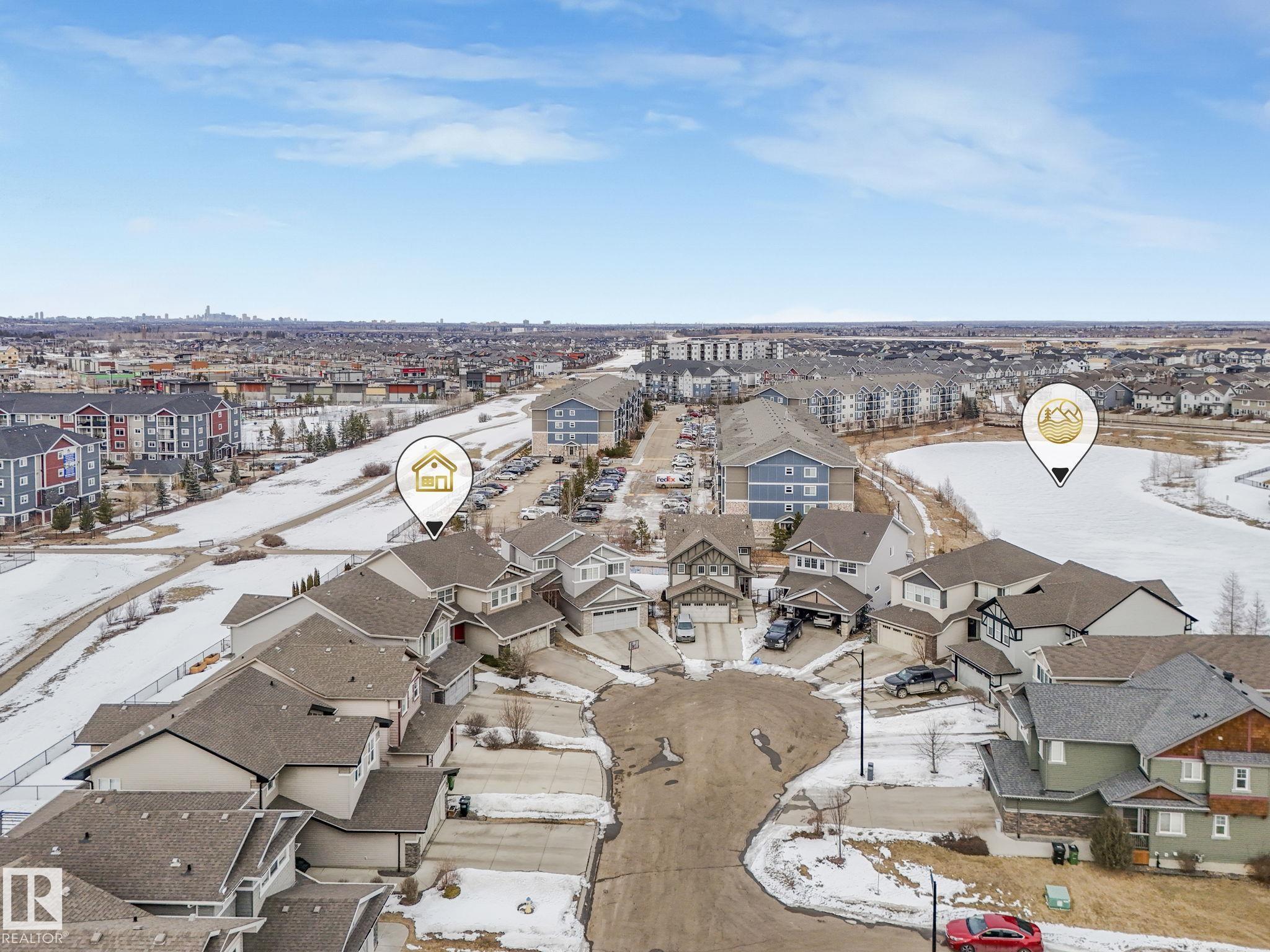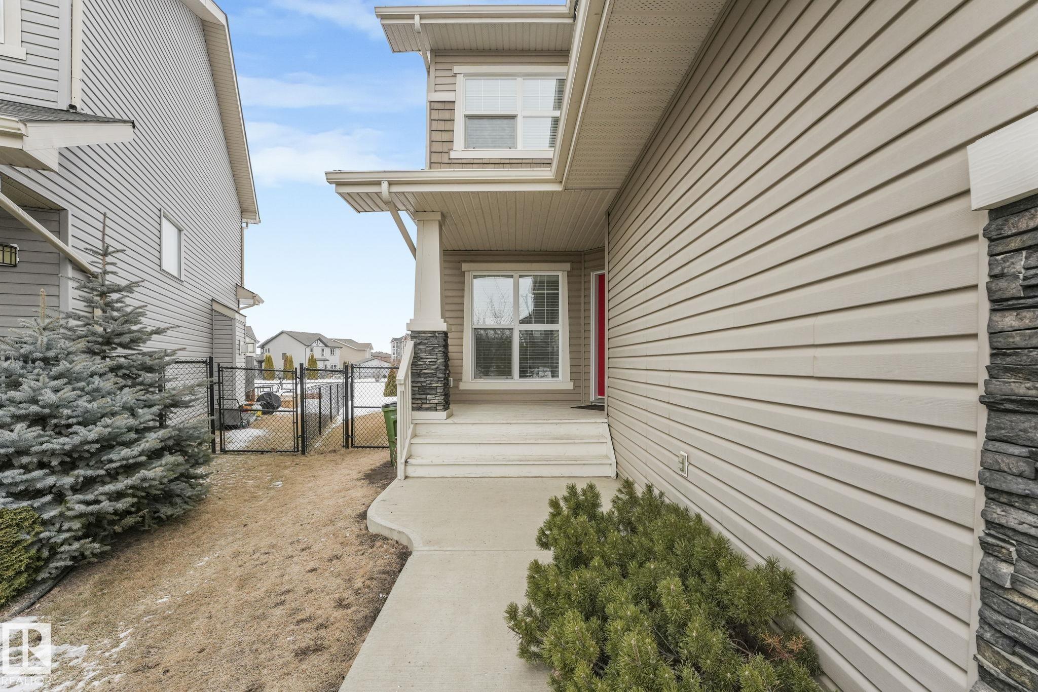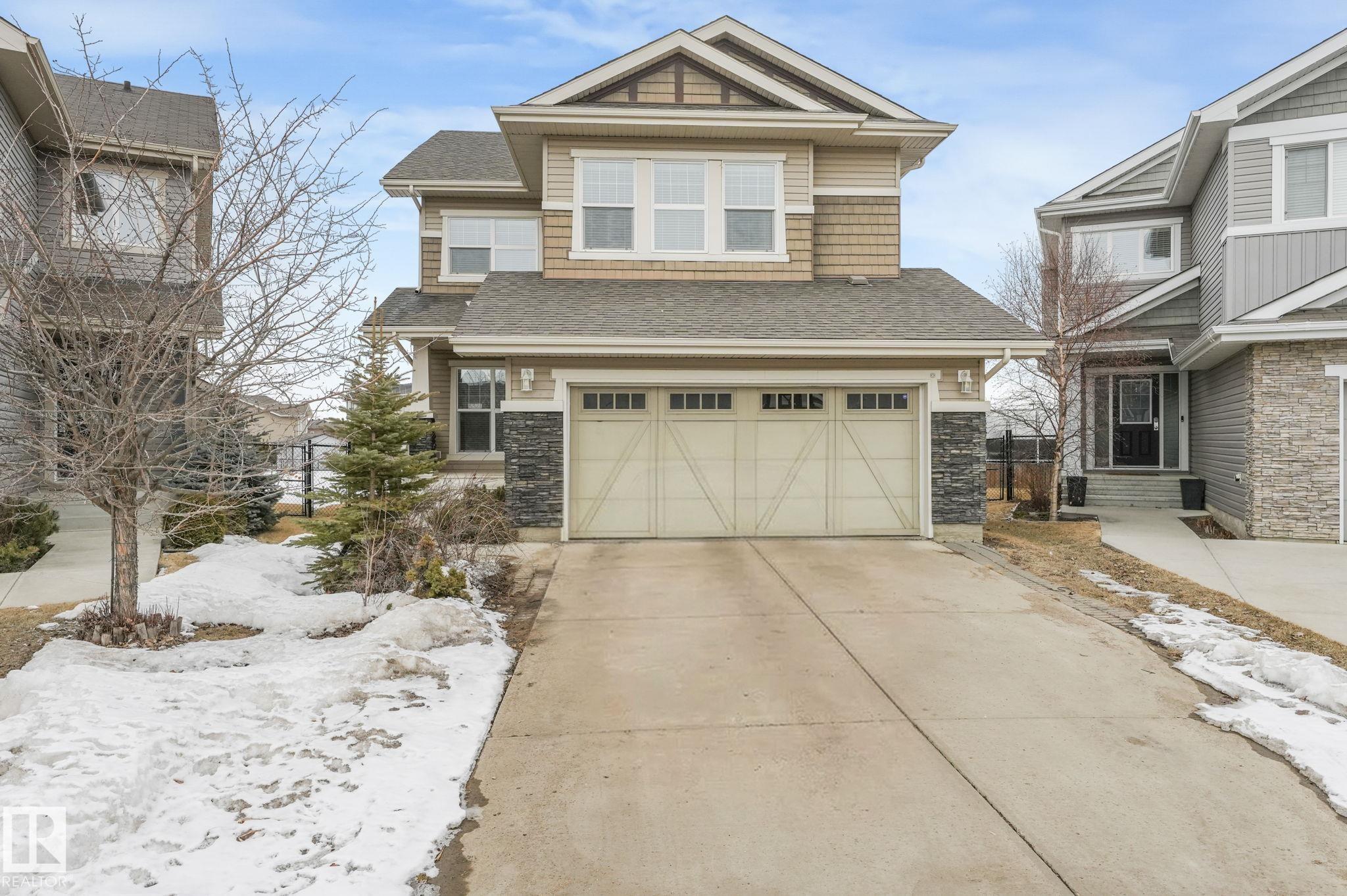This beautifully maintained 2-storey home offers 2,150 sq ft of living space, on a rare 7,500 sq ft pie-shaped/cul-du sac lot & backing onto a greenbelt. Built in 2012, this home features 4 bedrooms up, a main floor office, & move-in ready! The bright, open-concept showcases: hardwood flooring, large windows, a spacious living room w/ a mantle fireplace. The chef-inspired corner kitchen includes: granite countertops, gas range, stainless steel appliances, corner pantry, tile backsplash, & an eat-up bar, w/ picturesque views of the back yard. The kitchen flows into a sunny breakfast nook w/ direct access to the patio. Upstairs offers a generous bonus room, 3 seondary bedrooms, a full 4-piece bath, & a spacious primary suite, featuring: vaulted ceilings, a walk-in closet, & an upgraded ensuite. Located walking distance to all your daily ameneties, schools, & short drive to hwy 2 and Henday... this home is the perfect blend of space, comfort, & convenience. You're really going to love this one!