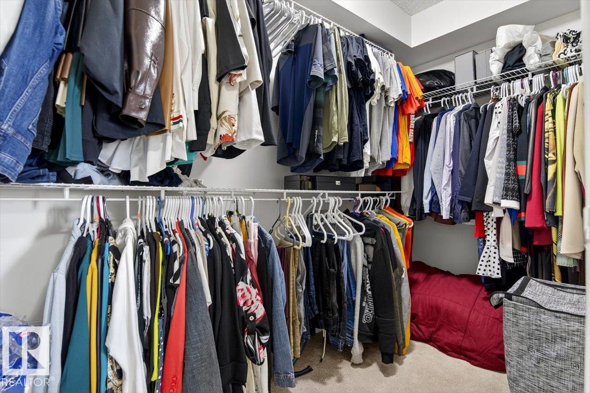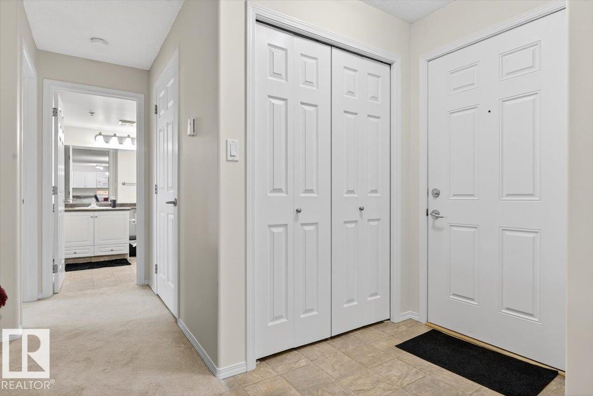 This 2 BED, 2 BATH condo offers a functional layout and welcoming feel. The open concept kitchen and living room connect to a true SPACIOUS DINING AREA, larger than many other units, making meals and hosting more comfortable. Enjoy an OVERSIZED BALCONY, one of the biggest in the complex, with a BBQ GAS LINE and a partial PRIVACY WALL for a more secluded outdoor space. Bedrooms are well separated for privacy, with the primary featuring an EN-SUITE. A second full bath and in-suite laundry add convenience. This 18-plus building offers secure entry, elevator, social room, and visitor parking. Includes UNDERGROUND PARKING WITH STORAGE. Unit was freshly painted throughout, including cabinets, and carpets were professionally cleaned. Close to Costco, Superstore, Manning restaurants, parks, transit, and quick Anthony Henday access, with nearby walking trails and green spaces for daily outdoor enjoyment, this home offers easy, low maintenance living in an established neighbourhood.